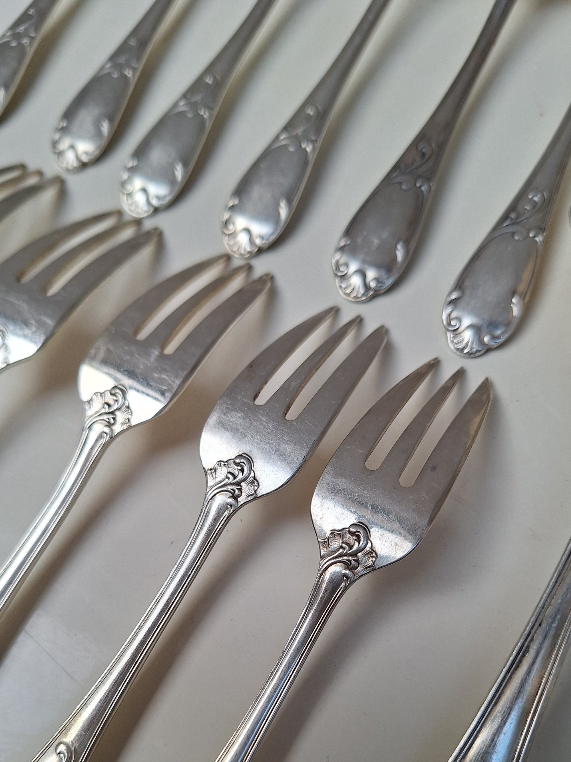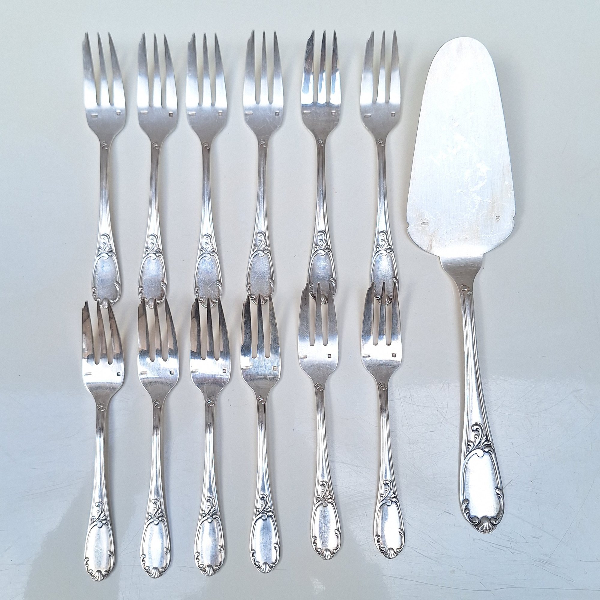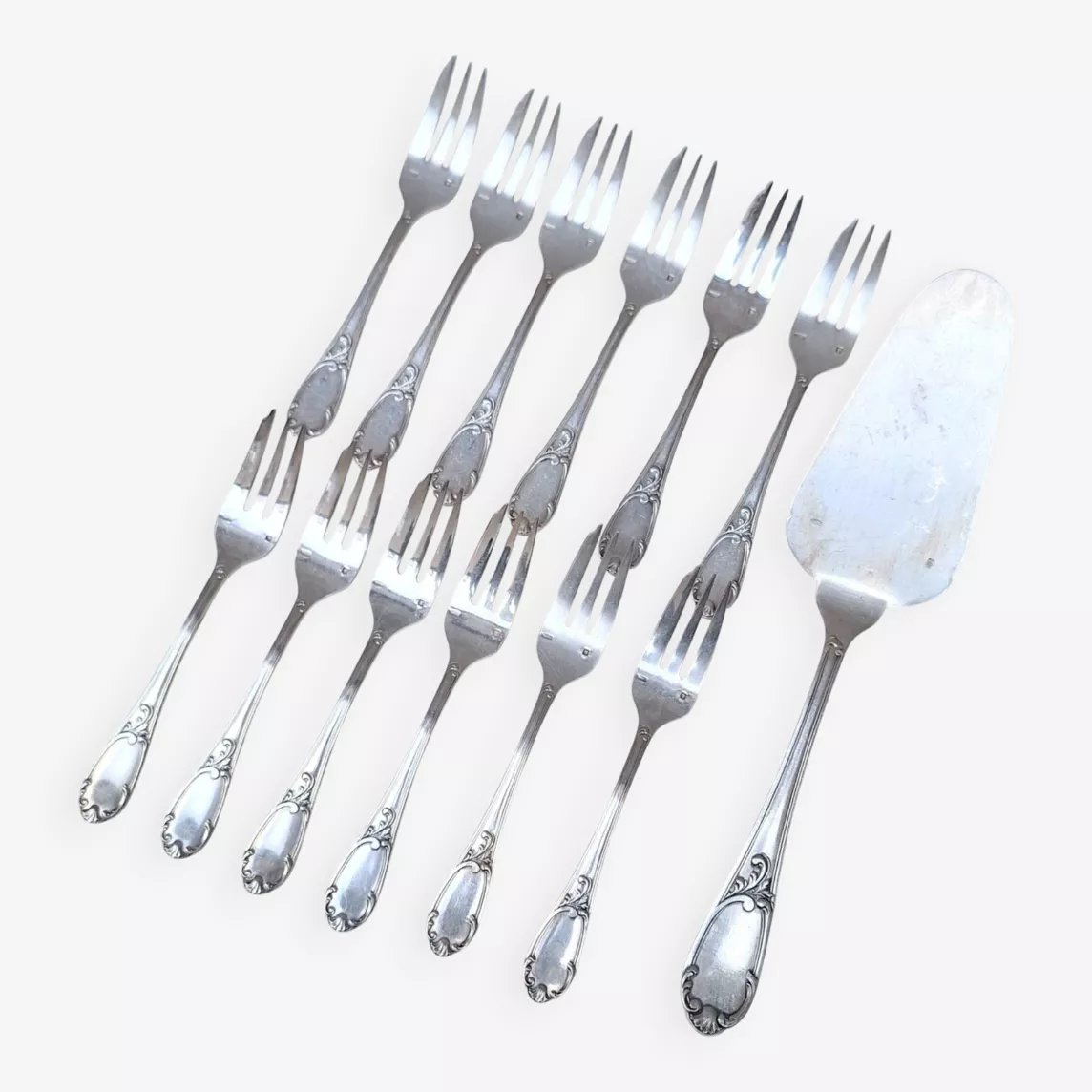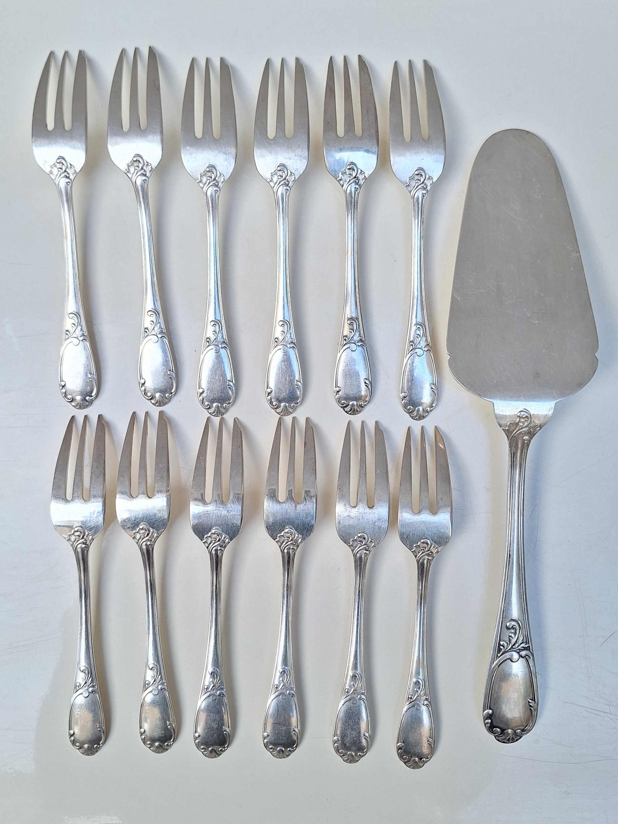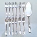 Service à gâteau en métal argenté comprenant 1 pelle à gateau et 12 fourchettes.