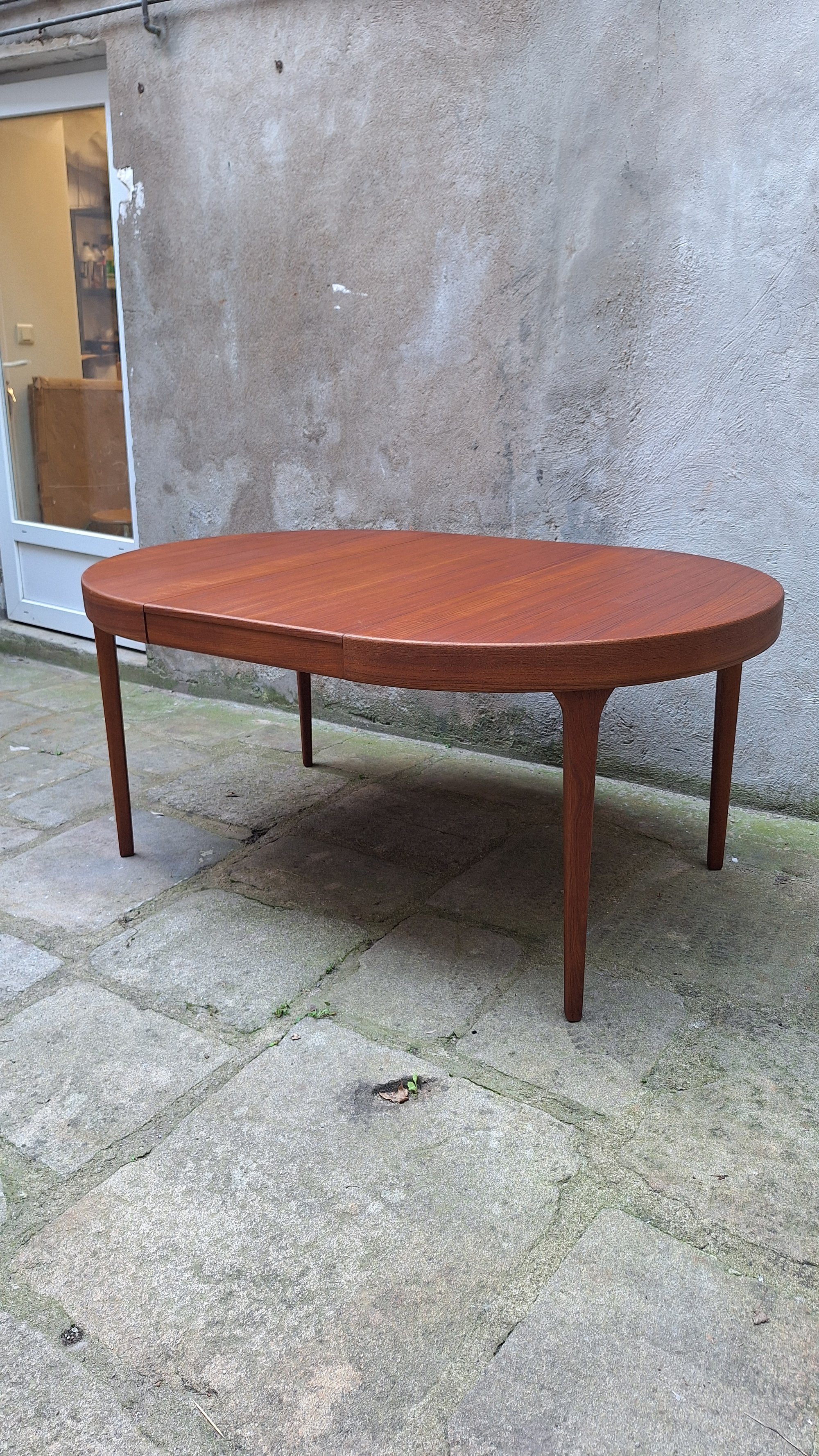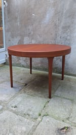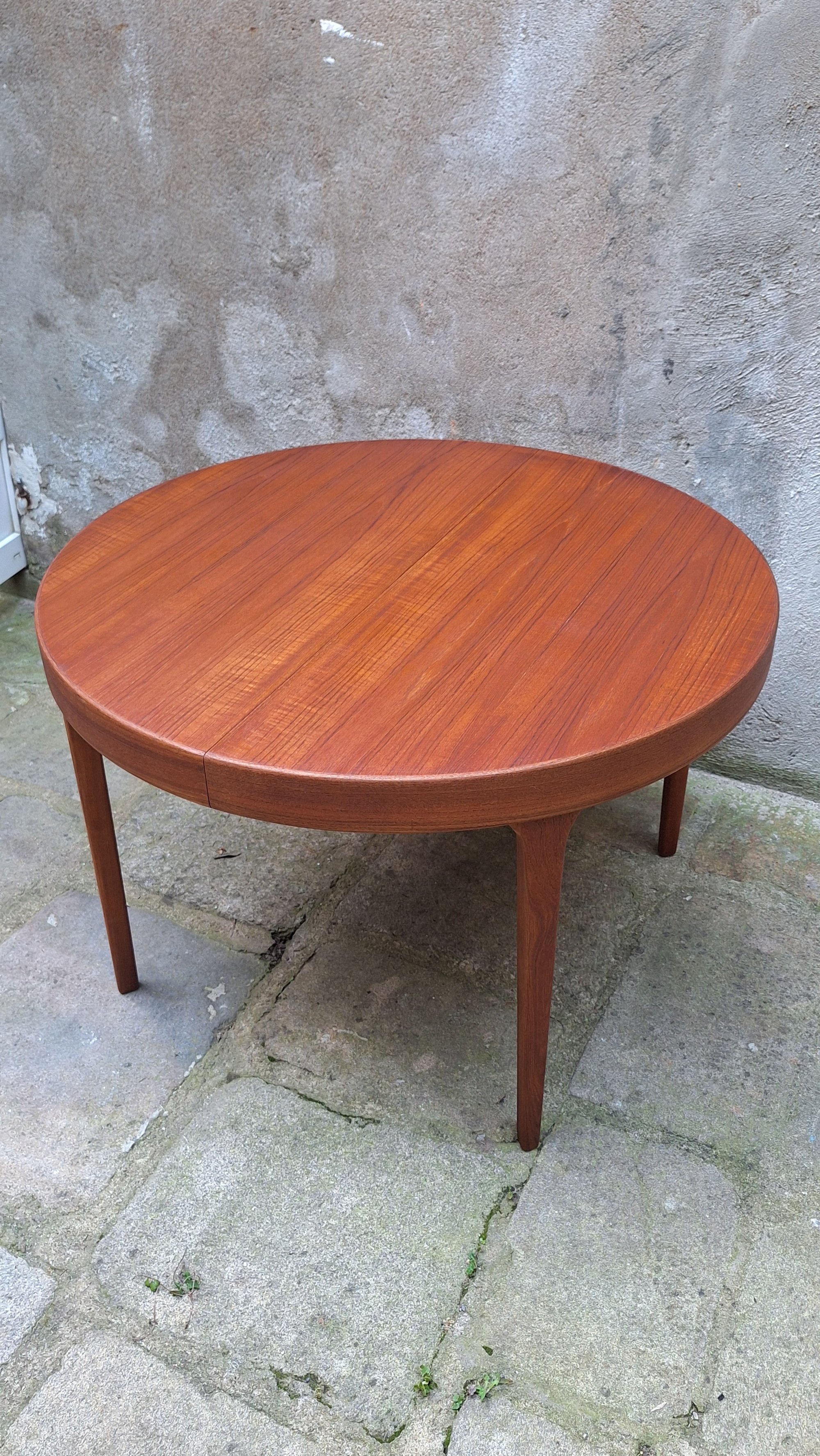 Belle table a repas ronde en teck et placage teck scandinave. Le vernis a été entièrement restauré dans nos ateliers. Rallonge de 50 cm pour passer de 110, 5 cm à160, 5 cm.